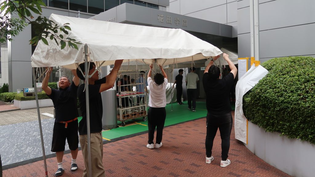 模擬店設営のため、朝早くからテントを立てる教職員や学生たちの表情は真剣そのもの。