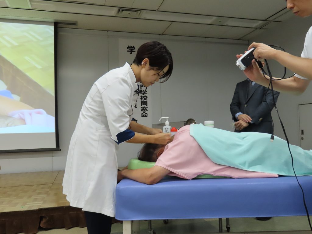 頭痛に対する鍼通電、坐骨神経への通電です。その場で参加者から質問を受けながら、とても分かりやすい実技供覧となりました。