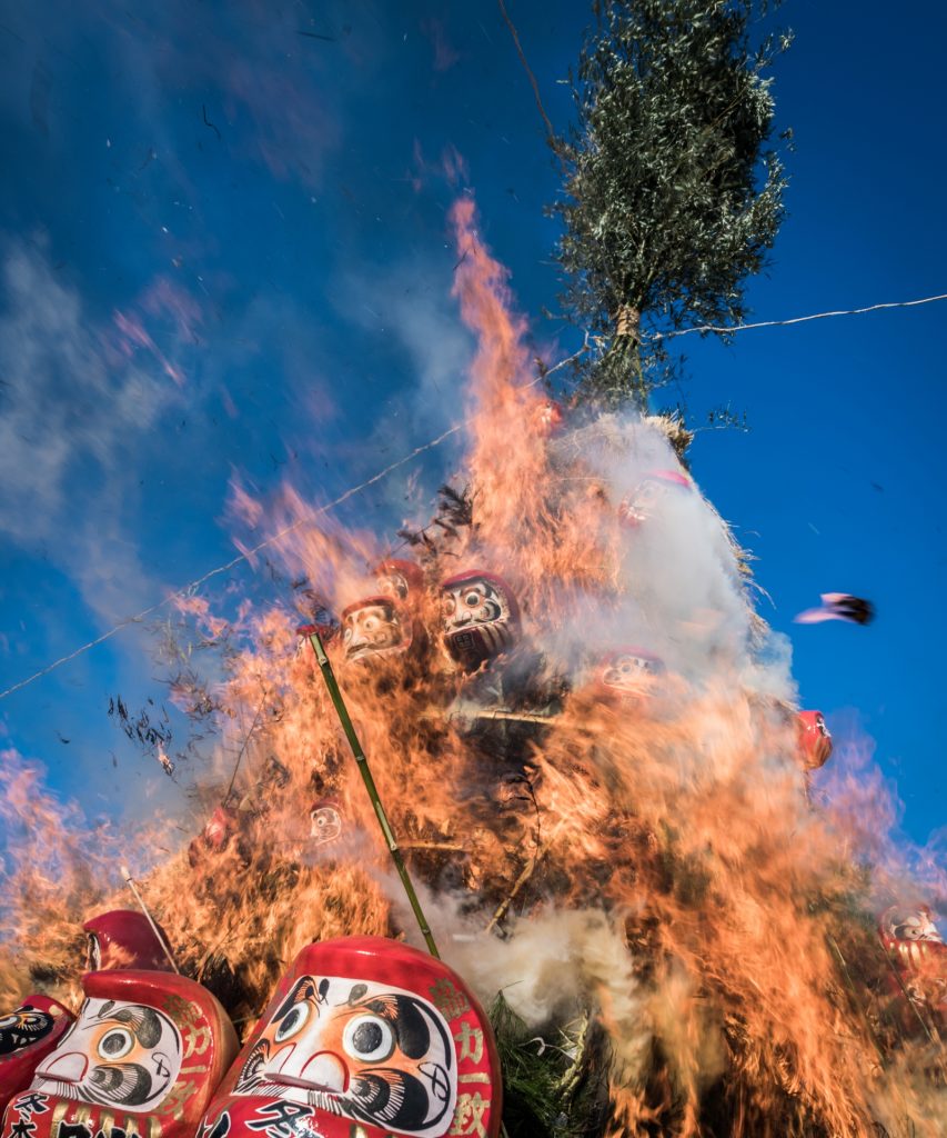 神社や地域の広場に、松飾り、しめ縄、書き初めなどが積み上げられます。神事の後、それらの飾りに火が放たれます。勢いよく燃え上がる炎は、歳神様が天にお帰りになるための煙道であり、その年の邪気を払う力があると信じられています。