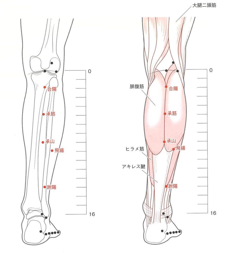 膝下の外側は16寸です。ですからこの方の足を16等分すると、黒い点の幅1つは、本人の1寸となります。これが「骨度法」(こつどほう)です。